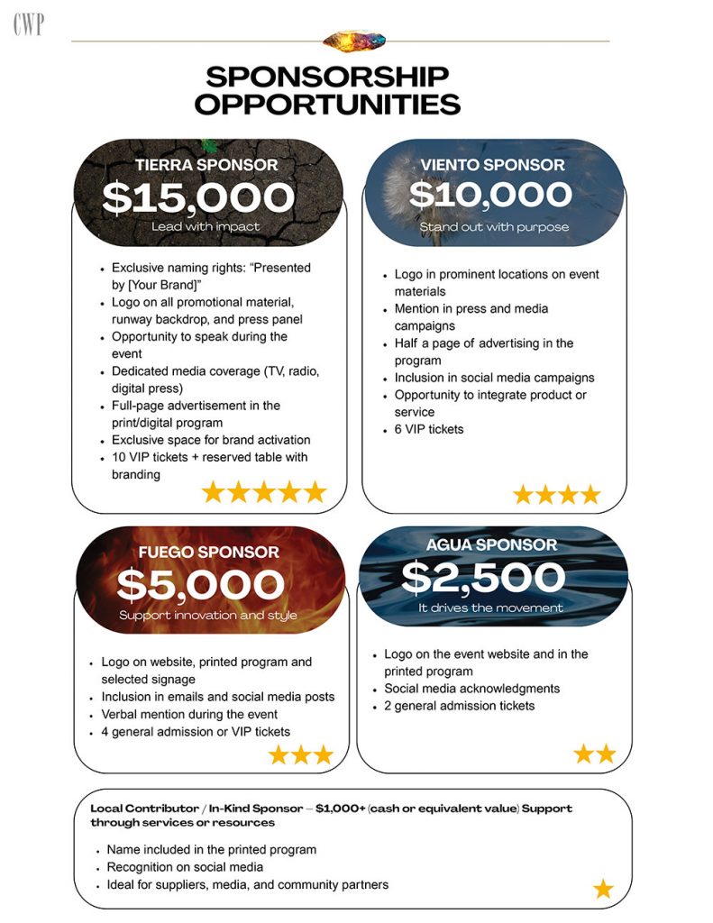Produced by CatWalk Pros, the event brings together local and international designers, wearable art, and visual artists, including a special auction contribution by artist and photographer Victoria Murillo. Tierra, Viento, Fuego, Agua promotes conscious fashion, environmental awareness, and cultural exchange, with a portion of proceeds benefiting Fundación Hogar de las Niñas de la Capital, a nonprofit dedicated to empowering girls in Panama.